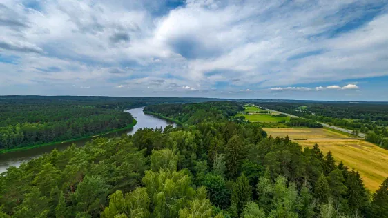 Atrodamies unikālā vietā - Nemunas cilpā. Mēs atrodamies starp divām Nemunām, kas tek kādu 200 metru attālumā. Skatam paveras Nemunas ieleja, mežs, Birštonas panorāma. Uz kādu brīdi var sajusties kā putns, kas pacēlies augstu virs kokiem.