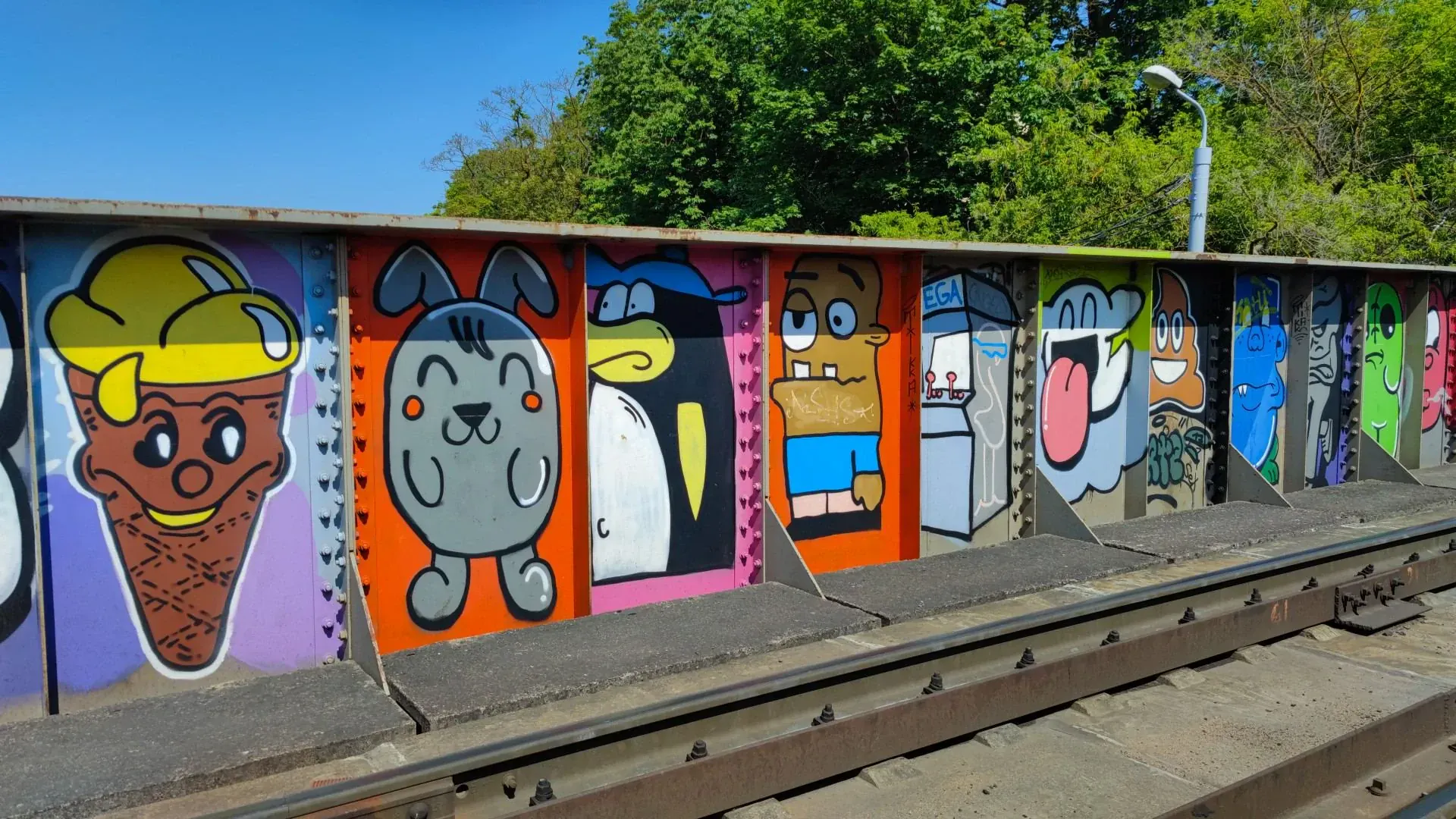 Tālāk ceļš ved uz Mežaparku pa Duntes ielu. Pa ceļam apskatām grafiti kas tapuši uz dzelzceļa tilta. Dodamies tālāk uz Mežaparku, lai dēlam parādītu kur agrāk cauri Mežaparkam gāja bērnu vilciens. Izbraucam pa stigu no viena galapunkta līdz otram. Neko daudz nav ko redzēt. Pāri palikuši pieturu peroni un tikai gulšņi norāda pareizo virzienu.