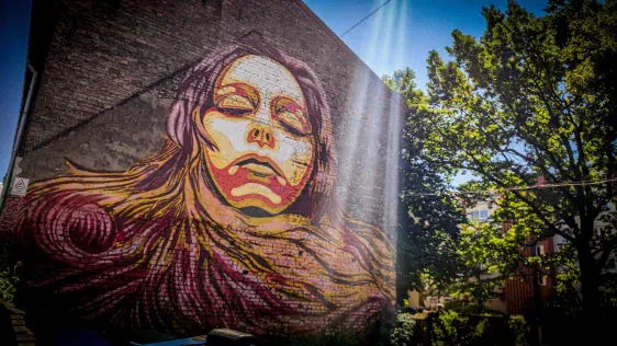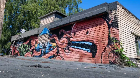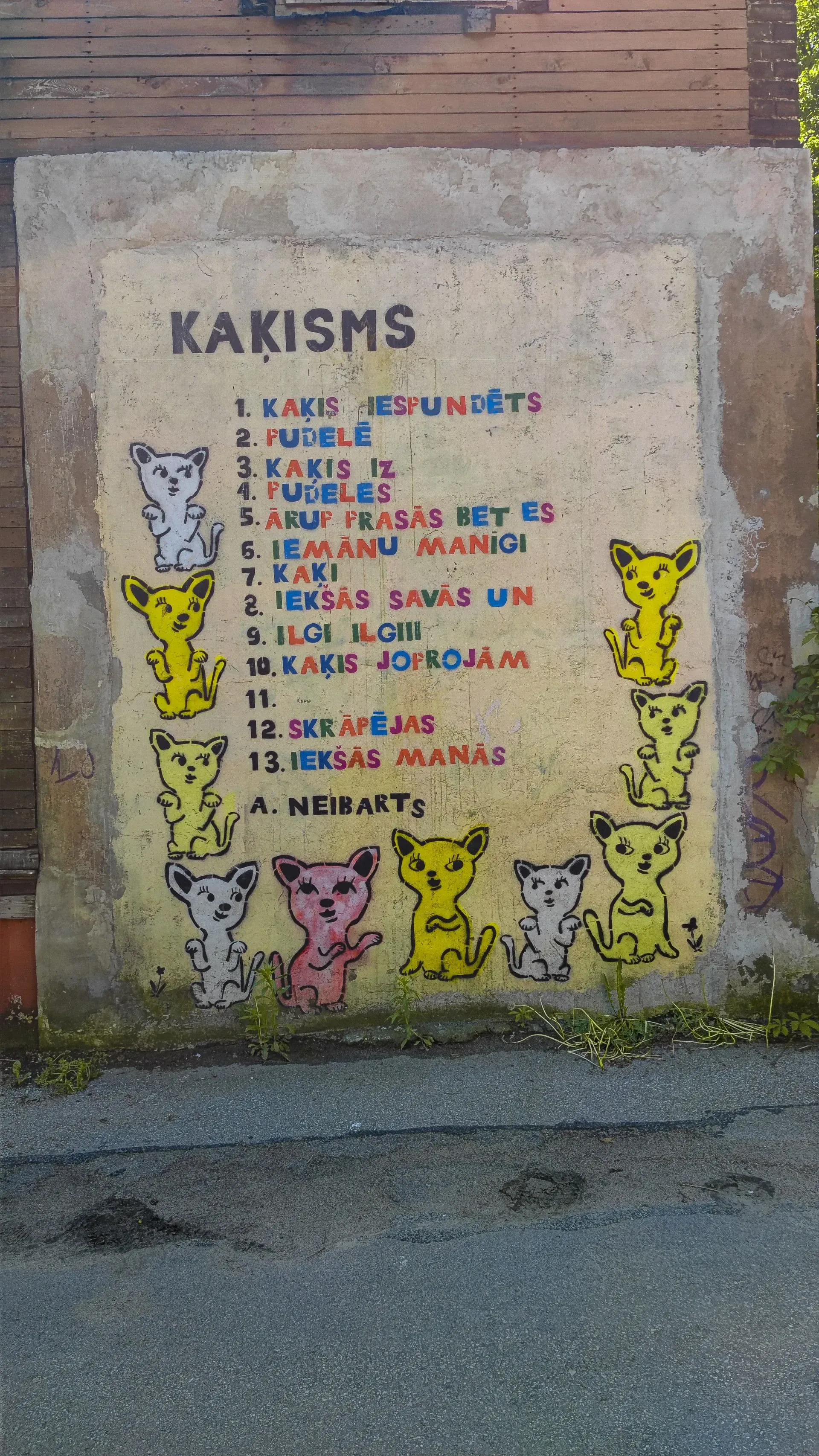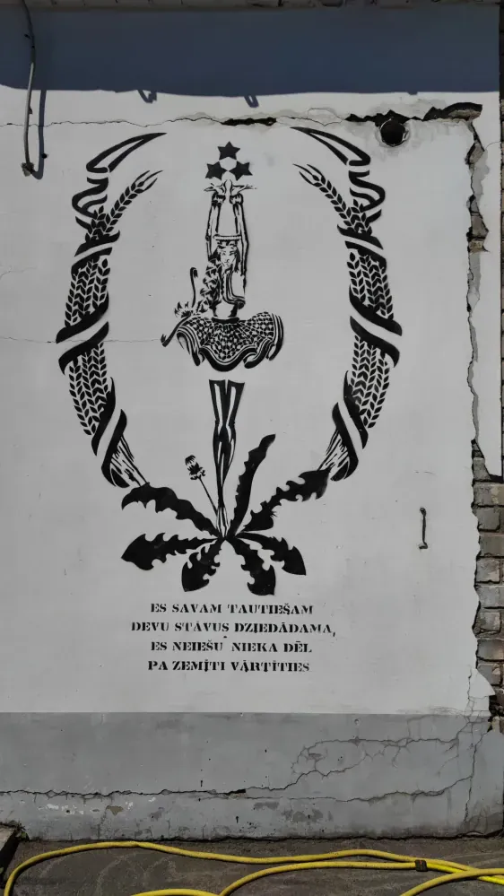 Izstaigājuši šo vietu, dodamies tālāk, kur zinu, ka jābūt vienam labam grafiti. Mazliet pamaldījušies nonākam nākamajā dīvainajā pagalmā ar savu mikro pasauli. Šī pasaule atrodas aiz Latvijas Mākslinieku Savienības RADOŠĀ KVARTĀLA kombināta MĀKSLA. Sienas rotātas ar izciliem grafiti (visu manu grafiti un murālu kolekciju var atrast šeit) un aizejot uz nākamo pagalmu vispār nav skaidrs kas tā par vietu, jo tur ir gan auto kuri tiek remontēti, gan kaut kādi mākslas veidojumi, kas stāv blakus no koka darinātam kalnu āzim. Sajūtas sirreālas.